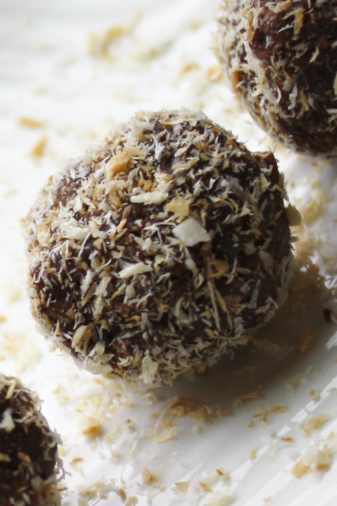 Toast the coconut by cooking in a heavy-bottomed pan over low heat. Be very watchful, shaking it around many times to evenly toast and to watch the golden hues develop. It will go from toasted to burnt pretty quickly! Set aside. Place all ingredients except coconut in a food processor and blend until cohesive. Add in 1/4 cup of the coconut. When desired texture is achieved, taste test for sweetness and add more dates or honey if desired. Pinch off small grape size (or larger) pieces and roll into balls. Roll each ball in the remaining toasted coconut!